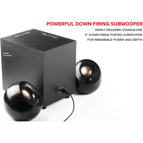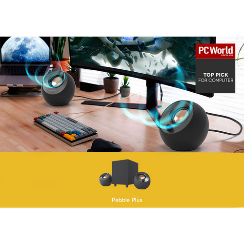 اسپیکر کریتیو مدل Pebble Plus نمونهی ارتقا یافته مدل قبلی یعنی Pebble است که در سال 2018 توسط مجله PC MAG مورد تحسین قرار گرفت. در این مدل ارتقا یافته علاوه بر تمام ویژگیهای مدل قبلی یعنی Pebble یک عدد سابووفر متناسب با این اسپیکر نیز به آن اضافه شده که باعث میشود بیس ایجاد شده را 2 برابر بهتر از مدل قبلی احساس کنید. در عین حال دارای طراحی ساده و جمع و جوری است و نکته مهم اینکه این مدل جدید و ارتقا یافته همانند مدل قبلی تنها از کابل USB به عنوان منبع تغذیه استفاده میکند. این نکته باعث شده که تنها اسپیکر موجود در بازار که دارای سابووفر است و فقط از طریق USB تامین انرژی میشود، همین مدل Pebble Plus باشد.