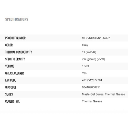 مشخصات فنیرسانائی گرمایی: بیشتر از 11 وات بر متر-کلوین PRODUCT NUMBER : MGY-ZOSG-N15M-R3 رنگ خاکستری THERMAL CONDUCTIVITY : 11 W/m-K حجم : 1.5ml مناسب برای انتقال حرارت و نیز عایق الکتریکی اتصالات SPECIFIC GRAVITY : 2.6 (g/cm3) 25°C درجه حرارت عملیاتی: بین منفی 40 درجه سانتی‌گراد تا 200 درجه سانتی‌گراد