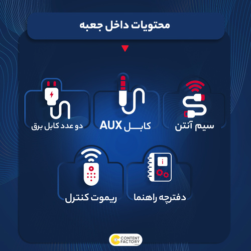 اقلام همراه بلندگوکنترل / دو عدد کابل برق / کابل aux / سیم آنتن / دفترچه راهنما